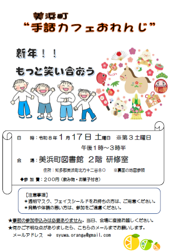 Chabs TOP Event / News(イベント情報・お知らせ) 手話カフェ 1月17日 開催(美浜町図書館:生涯学習センター2F) ALL Event News News 手話カフェ 1月17日 開催(美浜町図書館:生涯学習センター2F) 2025/12/29