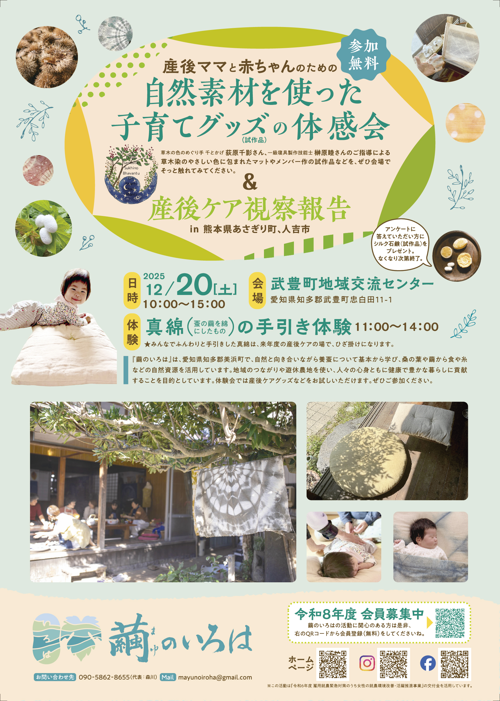 Chabs TOP Event / News(イベント情報・お知らせ) 「繭のいろは」からのお知らせ ALL Event News News 「繭のいろは」からのお知らせ 2025/12/04 自然素材を使った子育てグッズの体感会&産後ケア視察報告(熊本県あさぎり町、人吉市) 12/20(土) 武豊町地域交流センター(武豊町忠白田11-1)10:00~15:00 参加費無料 【体験 11:00~14:00】真綿(蚕の繭を綿にしたもの)の手引き体験 【繭のいろは】 美浜町の自然と向き合いながら養蚕について基本から学び、桑の葉や繭から食や糸などの自然資源を活用しています。地域のつながりや遊休農地を使い、人々の心身ともに健康で豊かな暮らしに貢献することを目的としています。